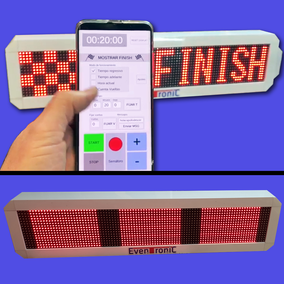 High performance display, capable of working as a traffic light (round and square), time counter, time counter, lap counter, clock and message display.
